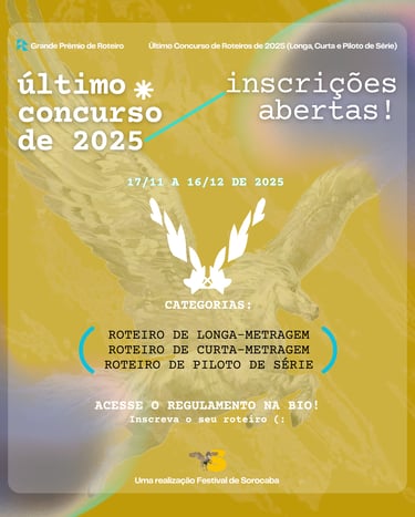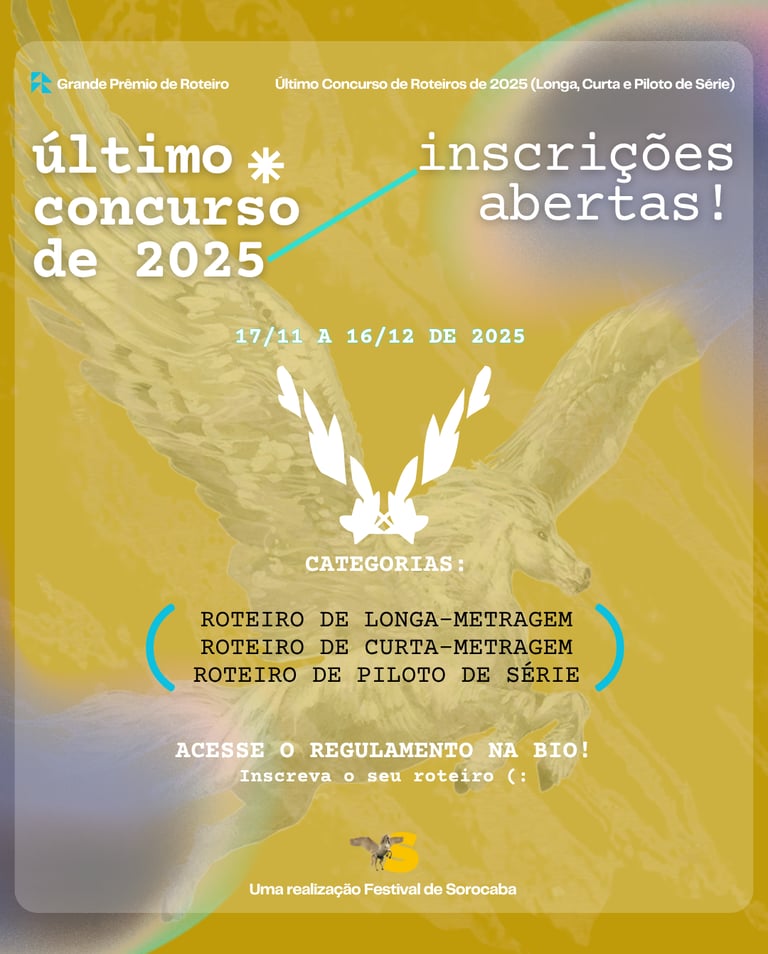 Inscrições abertas para o último concurso de ROTEIROS de 2025. Clique abaixo para inscrever o seu projeto ou acessar o regulamento do concurso.